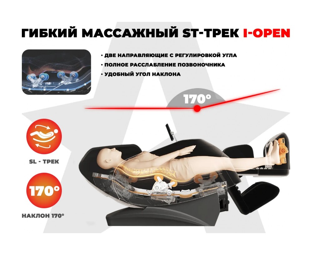- Передовой гибкий SL- трек I-OPEN 170 градусов эффективно обеспечивают полное расслабление позвоночника